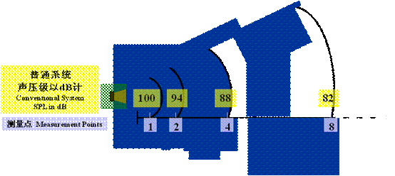 通过对比我们可以发现SLS的带状扬声器的衰减度要比点声源的小,这就有效的保证了其传输的距离。通过对比我们也不难发现SLS的线性阵列扬声器的声场要比传统的点声源要均匀能量更集中,垂直扩声比较小这就有效的降低了声反馈的发生。SLS的线性阵列扬声器是根据声波耦合原理,通过音箱单元的独特排列技术,即带状高音单元垂直阵列技术,降低各单元的声波相位干扰,不仅提高了声音的清晰度与均布度,而且也很好地提升了有效直达声。具体方法就是将每只全频单元垂直角度控制到“0”度,基于话筒只对其中的一只模块构成反馈关系的特点,抗啸叫能力非常明显,抗叫音量比传统音箱音量高出近20dB。全频单元垂直角度控制到“0”度,还有一个好处是在垂直方向再增加排列若干只相同的带状高音单元,近听人耳只能听到一只模块的声音,远听就会听到几只模块合在一起的声音,再加之它独有的衰减性,结果就发生了常理无法解释的现象:远听声不小,近听声不吵的全频声耦合特性(平行波)的直达声,这其中也就大大降低了声反馈的可能。